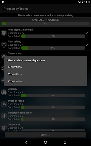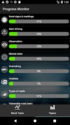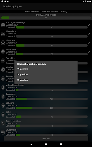* လေ့ကျင့်မှုသီအိုရီစစ်ဆေးမှု - အမျိုးအစားများဖြင့်လေ့ကျင့်ခြင်းဖြင့်သင်၏အသိပညာကိုစစ်ဆေးပါ။ သင်လေ့ကျင့်ရန်အမျိုးအစားတစ်ခုသို့မဟုတ်တစ်ခုထက်ပိုသောရွေးချယ်နိုင်သည်။ 10, 20, 30 မေးခွန်းများအတွက်လျင်မြန်စွာစမ်းသပ်မှုများကိုလည်းပြုလုပ်နိုင်သည်။ ဤအပိုင်းတွင်အချိန်ကန့်သတ်ချက်မရှိပါ။ မှန်ကန်သောအဖြေကိုမဖြေရှင်းနိုင်မီတရားဝင်ရှင်းပြချက်ကိုသင်တွေ့နိုင်သည်။