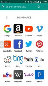 This mobile application browser have : Google,Amazon,Youtube,Vimeo,Google Plus,Facebook,Twitter,Pinterest,Reddit,Bing,Yandex,Info,Baidu,Wikipedia,Yahoo,People.