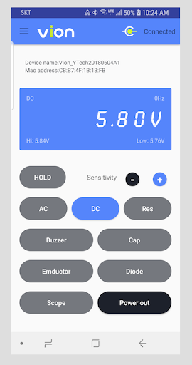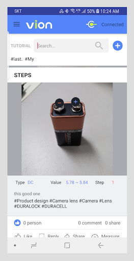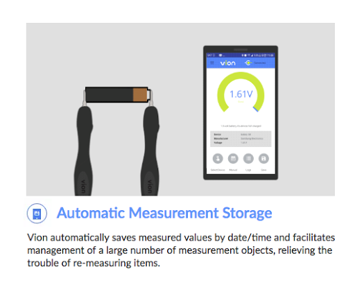 Most multimeters require you to turn the rotary switch to select measurement items and have electrical knowledge to understand the number displayed on the LCD in order to determine the fault. However, Vion can link to your smartphone and can automatically measure the product without having to select a measurement item. Vion diagnoses the measurement result as “Good/Bad” through voice guidance.