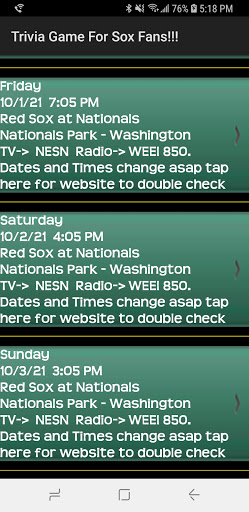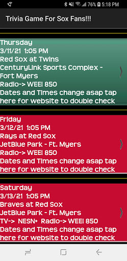 လူဆိုးများအတွက်လူဆိုးများအတွက်လူဆိုးများအတွက် Hard Red Sox ပရိသတ်များ (တီဗီနှင့်ရေဒီယိုစာရင်းများနှင့်) သေဆုံး လူဆိုး 61,000 ကျော်သည် Hard Red Sox ပရိသတ်များကဤအလွန်မြန်သော, ဒါကြောင့်သင် BEANTOWN ကိုလှည့်လည်သွားလာတဲ့အခါ "ဟေ့, ဒီညအနီရောင် Play play play play play လုပ်တာလား" ဆိုရင် "နောက် Xx Pox ဂိမ်းကဘယ်အချိန်လဲ။ သင်၏ Android ဖုန်း၏တစ် ဦး ကိုထိပုတ်ပါ။ အဖြေရှိသည် !!! အဘယ်သူမျှမဟောင်းနံနက်လွဲမှားခြင်း, ဒီ app ကဒီနေ့ရဲ့ရက်စွဲကိုသိတယ်, ယနေ့ရက်စွဲမှနောက်ဆုံးကစားပွဲကိုအလျင်အမြန်ပြသသည်။ ဝိုင်ဖိုင်မရှိသောဝိုင်ဖိုင်မရှိသောအခါ၌ပင်ဂိမ်း၏နေ့နှင့်အချိန်ကိုမြင်တွေ့ရဆဲဖြစ်သည်။