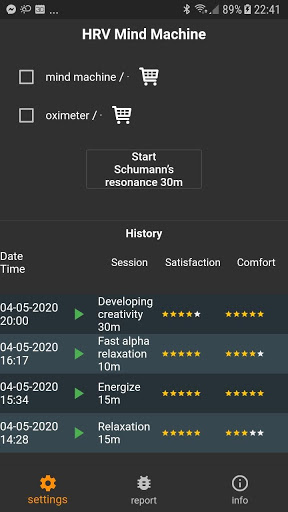 application ကိုဖွင့်ပြီးနောက်သင်တစ် ဦး ကိုသုံးရန်ရှိမရှိရွေးချယ် Oximer, Light Stimulation, အသံနှိုးဆွခြင်းသည်အမြဲတမ်းပြေးလိမ့်မည်။ ချိန်ညှိချက်များတွင်သင်သတ်သတ်မှတ်မှတ်ပရိုဂရမ်တစ်ခု, ဆွ၏အရောင်ကိုရွေးချယ်ပြီး Start ကိုနှိပ်ပါ။ ပရိုဂရမ်ကိုသင်ကိုယ်တိုင်အဆုံးသတ်နိုင်သည်သို့မဟုတ်သတ်သတ်မှတ်မှတ်အစီအစဉ်၏အချိန်အပြီးအဆုံးသတ်လိမ့်မည်။ သင်၏အဓိက parameters များပြောင်းလဲသွားပြီဆိုဒ်ကို အသုံးပြု. oximer တစ်ခုကို အသုံးပြု. ပရိုဂရမ်၏အဆုံးပြီးနောက်။ ထို့အပြင်ပတ် 0 န်းကျင်မှတစ်ခုခုကိုစိတ်အနှောင့်အယှက်ဖြစ်စေခြင်းရှိ, အရာအားလုံးကိုသင်၏သမိုင်းတွင်သိုလှောင်ထားသည့်နေရာကိုတိုင်းတာမှုများနှင့်သင်၏အကဲဖြတ်ချက်အပေါ် အခြေခံ. ပရိုဂရမ်တစ်ခုကိုရွေးချယ်နိုင်သည်။ သမိုင်းတွင် HRV တိုင်းတာချက်များကိုဂရပ်များရှိဖြည့်ဆည်းမှုများပြုလုပ်နိုင်သည်။