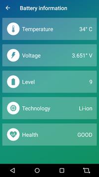 ✓ Detailed battery information within the main screen of the app. You will be able to see the percentage of battery energy as well as Temperature in C°, Voltage of battery and finally the level.