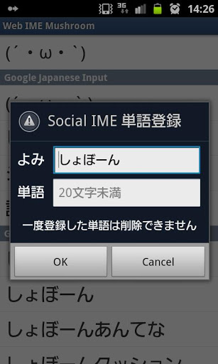 * Social IMEへの単語登録は一度行ってしまうと削除できません。登録した単語は他のユーザーと共有されますので、個人情報等の登録はしないようにしてください。