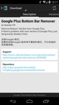 Remove Bottom Tab Bar from Google Plus, it's a Xposed module. This module will no longer be updated alone, it has been part of "L Tweaks" .