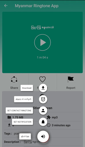 Myanmar Ringtone ဖုန္းျမည္သံ ( ဖုန္းမည္သံ) မ်ားကုိ Download / Upload လုပ္ၿပီး Share လုပ္ႏိုင္တဲ့ App ေလးျဖစ္ပါတယ္။