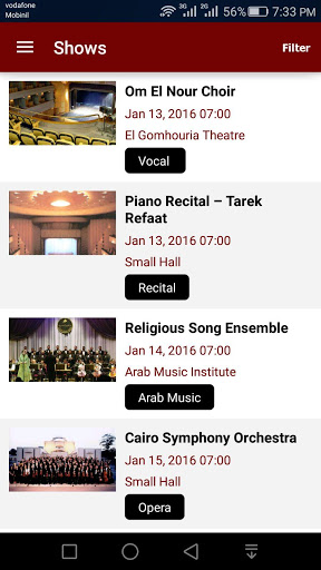 This mobile application will provide Cairo opera house’ users an easy access to the opera house’ shows, venues, companies and required information, through an easy to use mobile application,