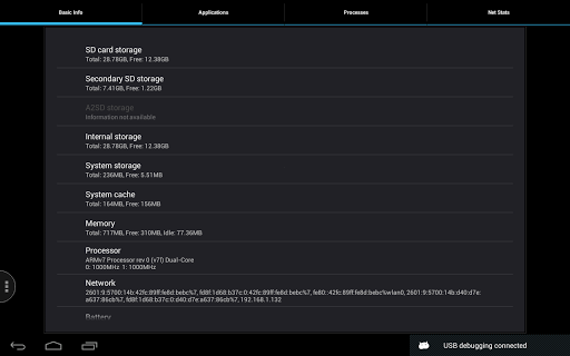 သင်၏ Android Platform အတွက်အခြေခံအချက်အလက်များကိုအမြန်ဝင်ရောက်ခြင်းသည် CPU, Memory, SD အတွက်အခြေခံအချက်အလက်များကိုအမြန်ဝင်ရောက်ခြင်း ကဒ်, လည်ပတ်နေသောလုပ်ငန်းစဉ်များ, ကွန်ယက်ပြည်နယ်များနှင့် install လုပ်ထားသော application များ။