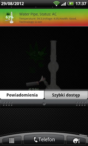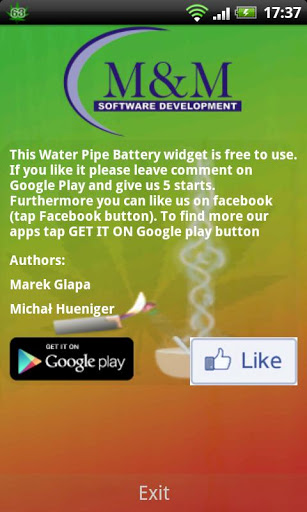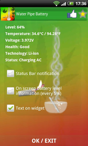 Cool Water Pipe BatteryCool Water Pipe Bongo Battery. This one have water pipe with as a theme. If you like themes related with ganja, marijuana, smoking weed and all this stuff, this widget is ideal for you. Essentials of every rastaman. Remember that marijuana is the drug in most countries.To add this widget to you home screen:1. tap and hold on free space2. chose Add Widget3. tap on Water Pipe Battery4. That is all, enjoy :Tap on Water Pipe Battery to get more battery information Above it, you can find facebook button and follow us, and when you press at star, there is a link to Google Play where you can give us some opinion. Below additional battery info you can find check box. You can set there:1. Battery level information in notification bar.2. On screen info every each 5.3. Battery level text on widget.This free battery indicator is really lightweight and does not drain battery. Check other apps from Mamp;M Software Development. Widget have some useful features like: High Definition layout HD Onscreen info about current battery level, every 5. When you play games or browsing websites you can control when your battery is discharged. Info in notification. When you write sms, email using facebook listening to the music or anything else you have current battery level in notification bar. When press on Widget icon you can get more battery information like: temperature voltage, health, technology and current status.This free app is ad supported and may contain ads in the notification tray.