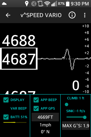 This app will give you a better image of what your v^SPEED Vario is doing as it transmits live bluetooth data of barometric altitude, vertical speed, and battery level. Other features include implemented GPS for GPS altitude, ground speed, and heading. The implemented Audio beeps are helpful for listening to each foot of climb as well as a variable sink tone. An implemented accelerometer is for keeping track of max G-force during a hard turn or spiral. The visual display includes a line chart of vertical speed, as well as scrolling altitude numbers so you can see your precise vertical velocity. The climb and sink thresholds are adjustable within the app, which also change the thresholds on the external vario automatically.