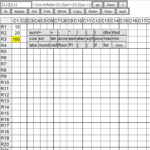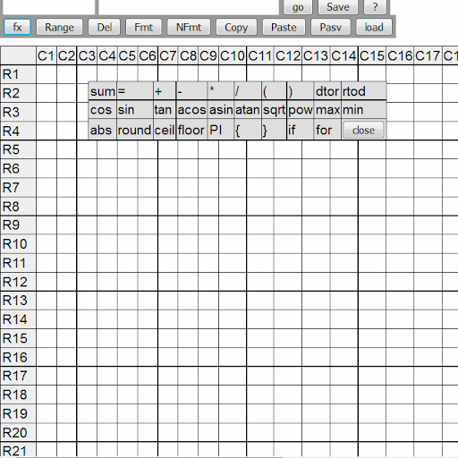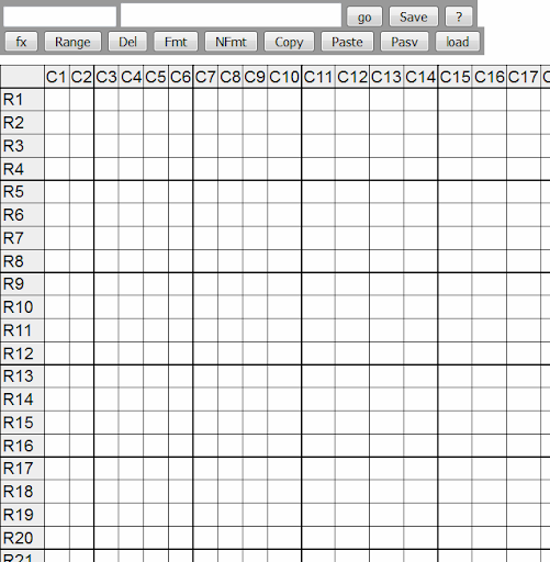 The user interface with formulae toolbar fx is improved. The contents of file saved can be viewed by Save as in FILE menu and copied and saved in notepad apps and can be reloaded from Open as in FILE menu and pasting the contents of file. Using Print from FILE menu the portion for printing may be scrolled and take screen shots.