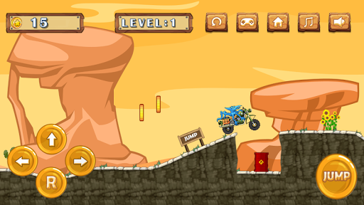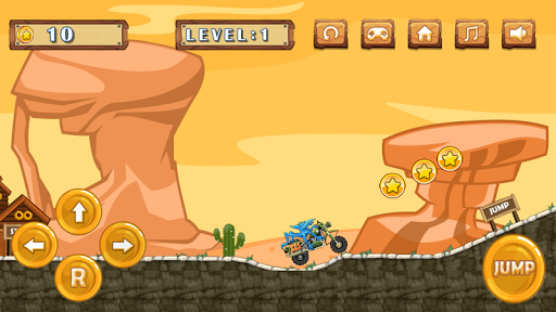 Race through each level in style, as the control features allow you to have precise control of your racing speed and to safely escape deadly obstacles. Use the left, right and forward arrow keys to direct your motorcycle. Hit the R button for brake control, and the space button to jump over the hills as you escape the danger. Performance on each level is saved. At the end of each level, a number of coins collected will place you at a rank on the ranking board of players.