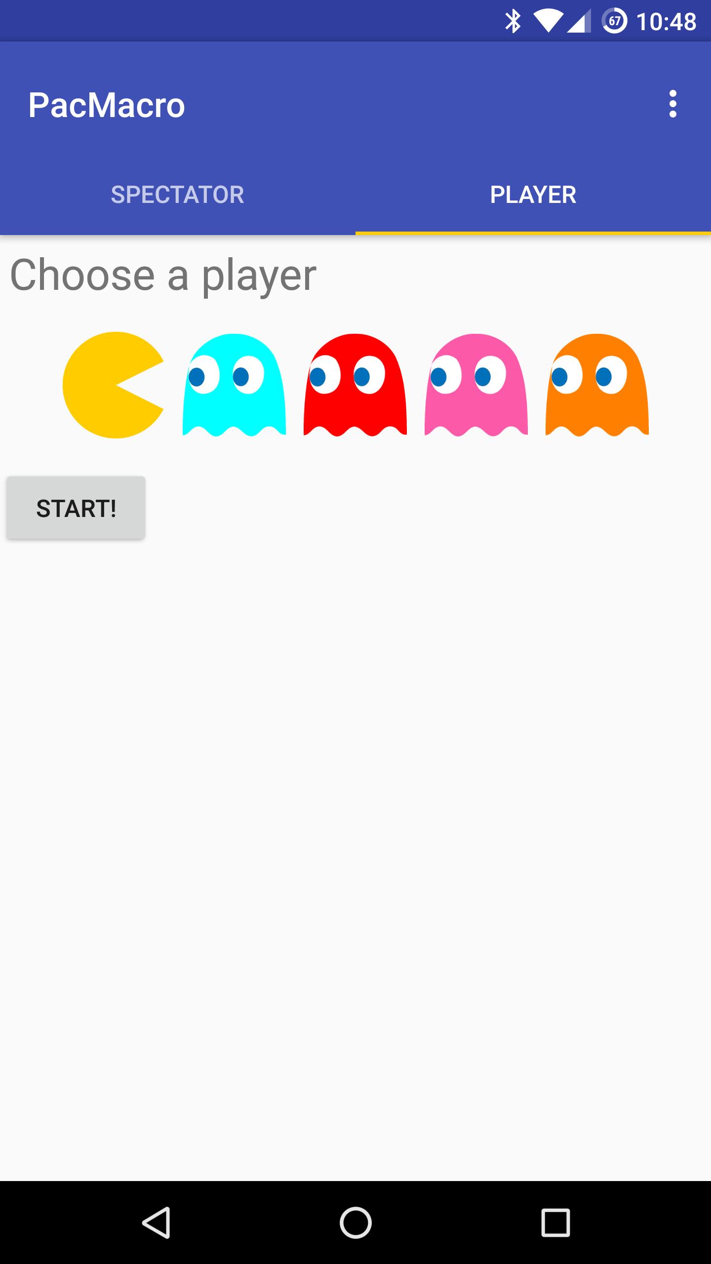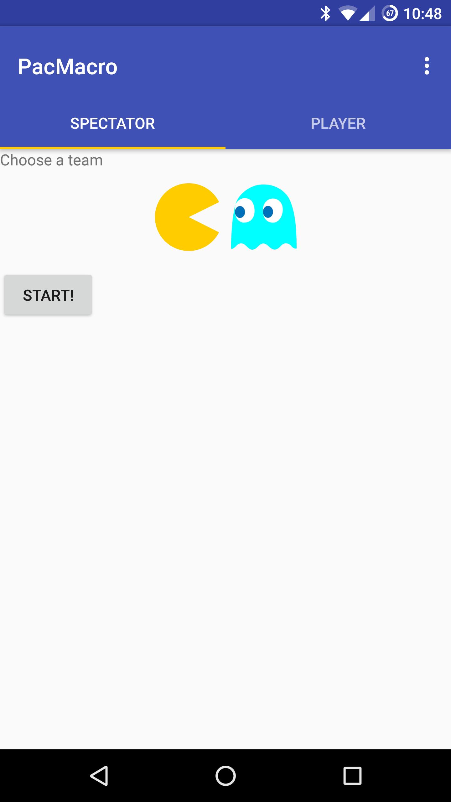 PacMacro is real life PacMan! Assign teams to each character (PacMan plus Inky, Blinky, Pinky, and Clyde), with one member from each team taking a phone with this app installed out into the city, using Player mode to track their location. Teammates that stay behind use their team's Spectator mode to watch things unfold over a map. Using voice chat to communicate with the players and the teams, the ghost teams work together to catch PacMan while PacMan and their team try to eat all the dots!