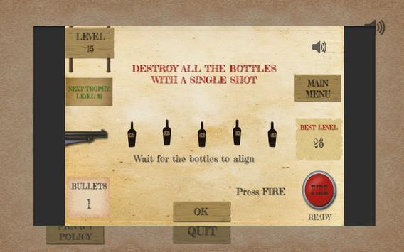 Do you have a good reaction time? Find it out! You need to be very precise to shoot the bottles at the right time and destroy them all with just a single bullet. The game starts really slowly, but get's faster as you progress. Reach certain highscores and earn trophies!