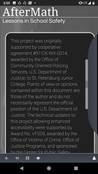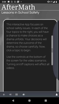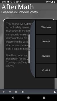 AfterMath is an interactive teaching tool for school resource officers, teachers, administrators, parents, and students. Although the program may be viewed by an individual student at a computer, on a cellphone or a tablet, it is recommended to be used as a classroom presentation tool, run by an instructor who can facilitate and guide discussions as questions and comments arise. The program provides a vehicle to facilitate discussions on sensitive topics such as Weapons, Alcohol, Suicide, and Conflict. It also gives opportunities for instructors to inform students about policies specific to their schools.