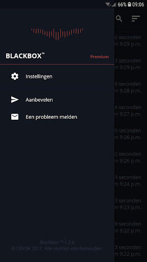 Gebruikers moeten zich ervan bewust zijn van de wet- en regelgeving in hun land met betrekking tot het opnemen vna telefoongesprekken en deze naleven om het plegen van inbreuk op locale of internationale wetten te voorkomen. Door gebruik te maken van Blackbox™ accepteer de gebruiker de bovenstaande mededeling en gaat ermee akkoord dat de ontwikkelaar niet verantwoordelijk is voor misbruik of verkeerd gebruiker van de toepassing door de gebruiker.