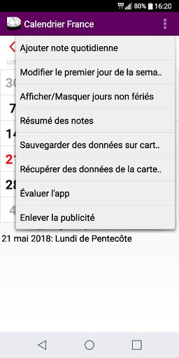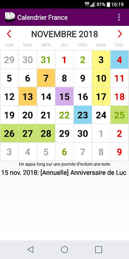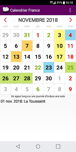 Vakantie op feestdagen worden getoond in Rood en religieuze of civiele vakanties zijn aangegeven in Green en Calendar biedt ook extra functies: