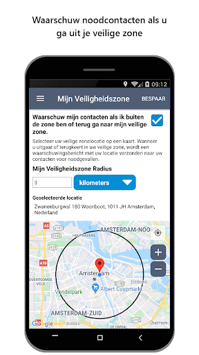 • Waarschuw mijn contacten voor noodsituaties als ik uit mijn veilige zone kom: Laat uw dierbaren op de hoogte zijn van uw veiligheidsstatus. Omcirkel je veilige zone op een kaart. Wanneer u verder gaat dan uw veilige zone of weer binnenkomt, wordt een waarschuwingsbericht met uw locatie verzonden naar uw contacten voor noodgevallen.