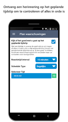 • Plan een veiligheidscontrole: stel een tijdstip in waarop de toepassing u zal vragen of alles in orde is. Als u niet reageert door op 'OK' te klikken, wordt een waarschuwingsbericht verzonden naar uw contacten voor noodgevallen.