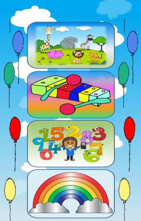 1. Animals: In this section, you can listen to the sounds of touching pictures of animals in their interests. You can play a particular song, accompanied by key note. Or you can have fun from time to compete in the games specially developed for your child.