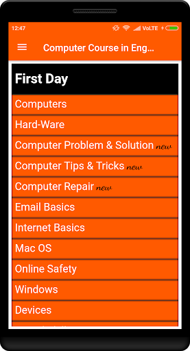 This Computer Course application is specially designed for the people who want to learn the basics of the computer operations. You can learn operating a computer in just 15 days via learning from this simple application. This application is in HINDI and explain all the things very clearly with images and simple text, so that anyone can understand and learn. It does not require you to be an expert in computer programming or english to learn computer basics.
