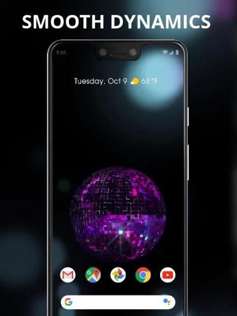The live wallpaper features Cool glitter ball live wallpaper. The scene was built with parallax effect to bring you a feel of a vast 3D effect on your home screen.