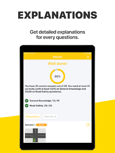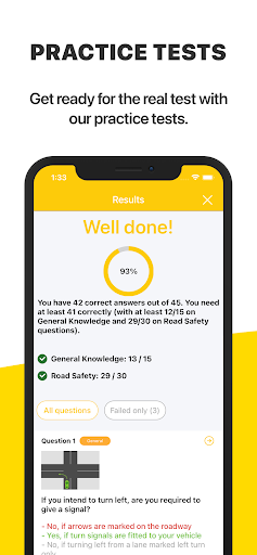 Onze app reproduceert dezelfde voorwaarden als het echte examen waarmee u wordt geconfronteerd bij de RMS Practice Driver Knowledge Test.U krijgt 45 vragen met 3 suggesties.U hebt minimaal 41 juiste antwoorden nodig (met ten minste 12/15 over algemene kennis en 29/30 over vragen over verkeersveiligheid).Wees ervan overtuigd dat u uw rijbewijs krijgt met onze app.