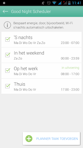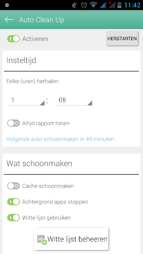 De geïntegreerde Good Night scheduler kan functies zoals WLAN of mobiele connectiviteit automatisch uitschakelen tijdens aanpasbare perioden. Laat uw smartphone 's nachts slapen en houd kostbare batterijenergie met Ashampoo Droid Optimizer.