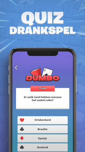 Dumbo is een gratis drankspel dat je volledig offline kunt spelen. Ondersteunt minimaal twee spelers, maar kan met grote groepen worden gespeeld.