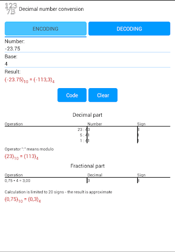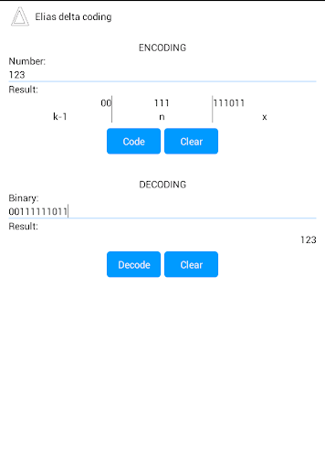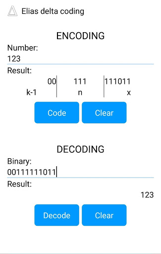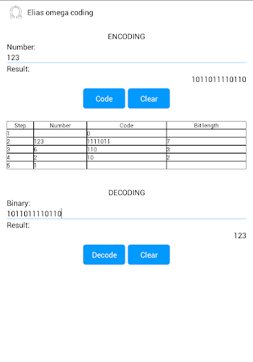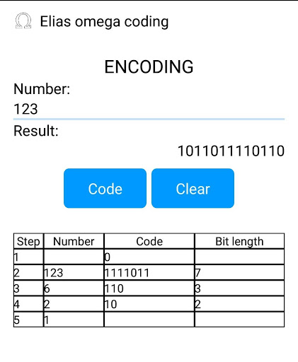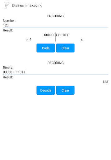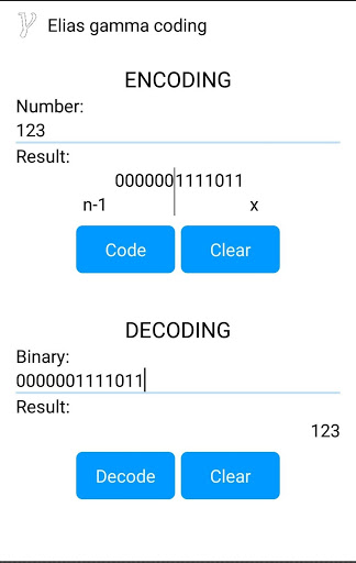 Easy Coding is simple App which let's You code, decode and check Your coding result in variety of algorithms like Elias Gamma, Elias Delta, Elias Omega, Huffman's Algorithm, Shannon's Coding, Shannon Fano Algorithm, LZ78, LZW. Easy Coding helps you learn how to convert numbers to and from a decimal system to a binary, octal, hexadecimal or system with a different basis up to 32.