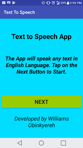 The English Text To Speech App is an educational App. The App will speak both words and sentences entered a in a from of text. Just enter any word and it will speak it. The Apps is capable to accept multiple line sentences and speak the sentence. Very good application for users who want learn English language. If you want to perfect your pronunciation in English Language then this App will help you.