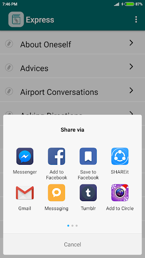 Express is an educational (language learning) application which provides commonly used expressions on various conversation topics such as Shopping conversation, Airport conversation, etc. This application helps to improve English speaking for non-native speakers.