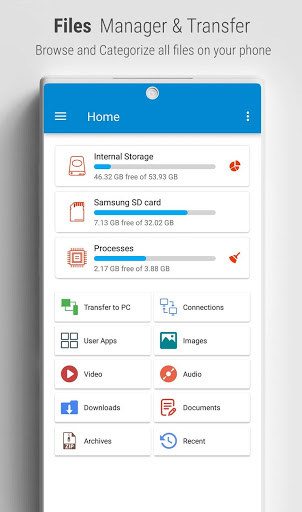 Bestandsbeheer beschikt over een ingebouwde RAM-reiniger en procesbeheer. Met deze functie kunt u een lijst maken van alle geopende applicaties, een proces doden waarbij uw batterij en RAM worden leeggemaakt om uw telefoon op te peppen.