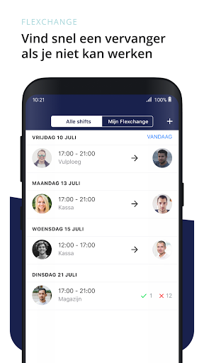 Door integraties met je roosterprogramma kun je op de app altijd een up-to-date rooster vinden. En met de Flexchange functie is het makkelijker om een vervanger te vinden als je opeens niet meer kan werken.