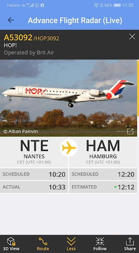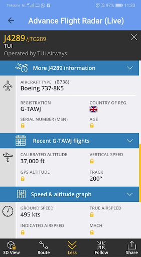 - Read detailed flight information like calculated speed, altitude, traveled distance, aircraft model, airline information, the aircrafts flight number, departure time, estimated arrival time an actual photo of the aircraft and much more;