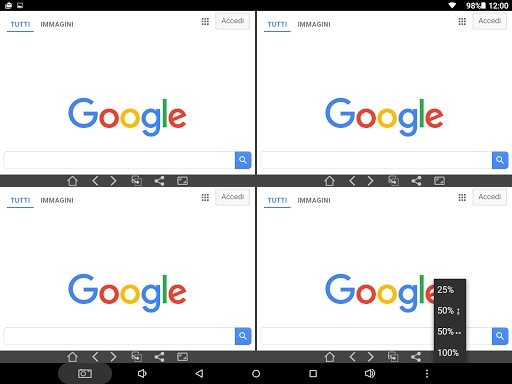 Four Tabs Tablet (free Internet Browser) e specifico per Tablet, è un Internet Browser che consente di visualizzare sino a quattro schede di navigazione contemporaneamente. Puoi ingrandirle in maniera indipendente, puoi trasferire gli URL da una scheda all'altra, puoi scegliere il motore di ricerca preferito!