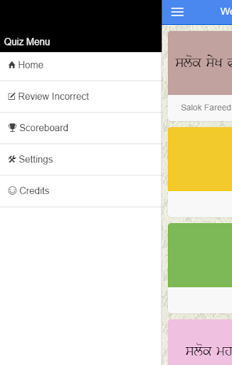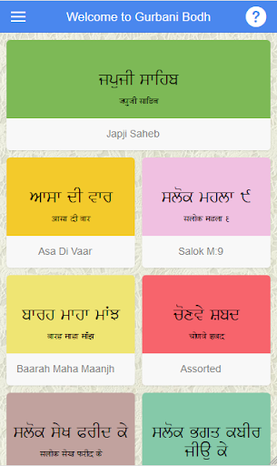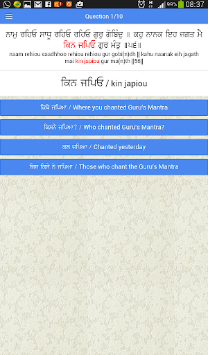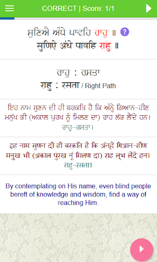 om dit interessanter te maken, is de app ontworpen als een quiz. Het geeft een Gurbani Tuk weer en vraagt u betekenis van een woord in de tuk met 4 opties om uit te kiezen. Na elke vraag legt het de betekenis uit van het woord en de complete Gurbani Tuk in het Engels en Punjabi. Elk juist antwoord draagt bij aan uw score. Elke quiz vraagt 10 vragen. Aan het einde van elke quiz toont het alle vragen die in quiz zijn gevraagd samen met hun Punjabi, Hindi en Engelse betekenissen voor u om opnieuw te verwijzen naar alle vragen.