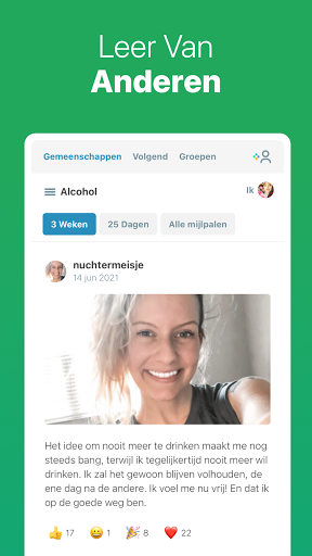 De app trackt niet alleen je nuchtere dagen, maar helpt je ook om nieuwe gewoontes op te pakken en biedt constante motivatie door je in contact te brengen met een groot netwerk van mensen die allemaal hetzelfde willen bereiken: elke dag weer sober blijven.