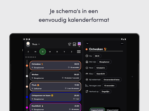 - Schema's: automatiseer je lichten om te vervagen, wijzig de kleur en schakel in/uit, allemaal zichtbaar in een eenvoudige kalenderweergave.