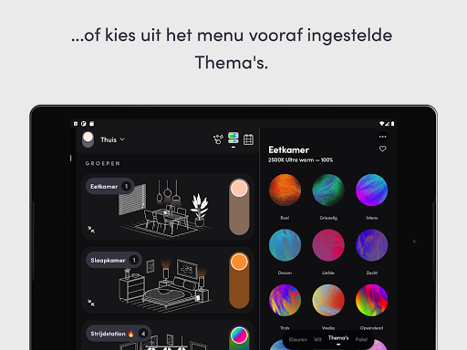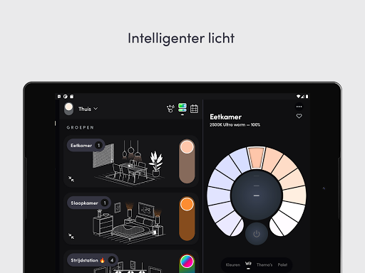 - Groepen: controleer eenvoudig alle lampen in een groep, inclusief aan/uit en dempen met één actie vanaf het home-dashboard.