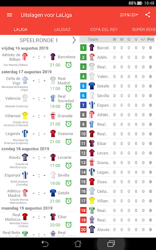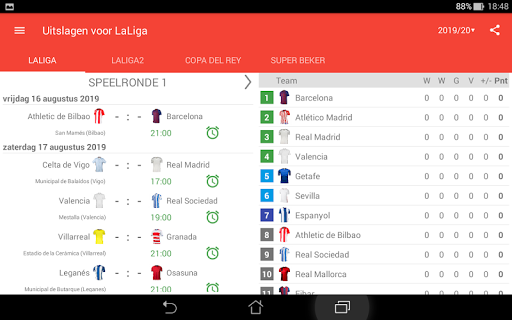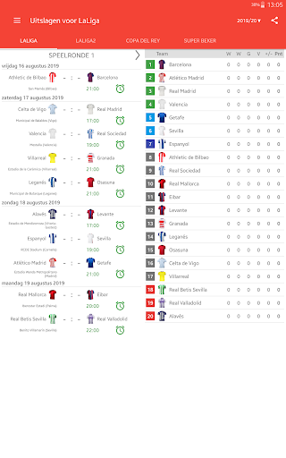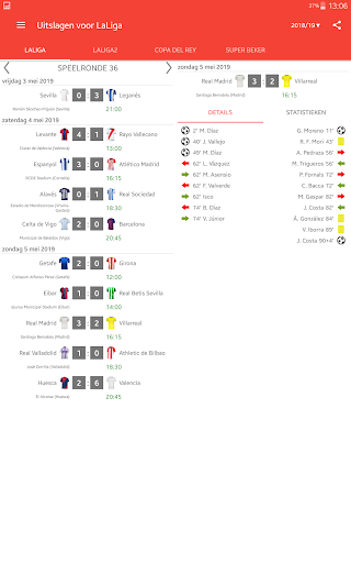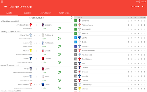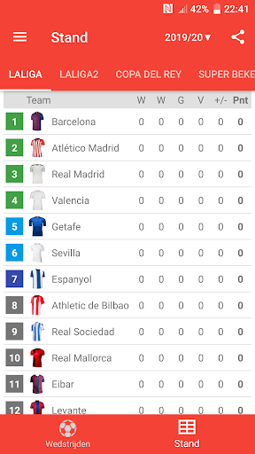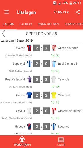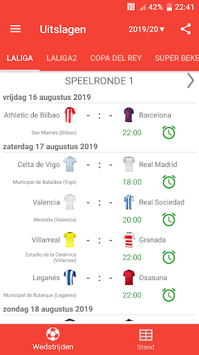 Uitslagen voor La Liga 2023/2024 is de app die u zal toestaan om de wedstrijden van het kampioenschap voetbal in Spanje online te volgen, zelfs als je geen tv of live stream hebt. Het bevat ook een kalender, schema van de wedstrijden, klassementen en scores van LaLiga EA Sports, LaLiga Hypermotion, Copa del Rey en Super Beker. Met de toepassing zal u geen doel missen of begin van een wedstrijd, want het geeft je een push-notificaties zal sturen. U kunt uw favoriete wedstrijden selecteren en meldingen ontvangen alleen voor hen. In LaLiga het seizoen 2023/24 spelen de teams: FC Barcelona, Real Madrid, Sevilla FC, Almeria, Cadiz, Granada, Las Palmas, Rayo Vallecano, Real Sociedad, Mallorca, Girona, Atlético de Madrid, Villarreal CF, Alaves, Getafe CF, Osasuna, Real Betis, RC Celta, Valencia CF en Athletic Club.