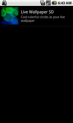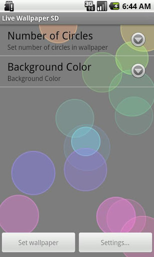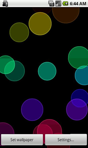 Simple free colorful circle bubbles live wallpaperCool simple colorful free live wallpaper LWP application for android Includes simple to integrate options:TO USE: Homegt;Press Menugt;Wallpapersgt;Live Wallpapers gt; Live Wallpaper SD and quot;set wallpaperquot; change number of circles use lower number for better performanceNumber of Circles440 change color of background Colors for background:Black, White, BlueGreen, Blue, Red, Gray, Orange and Yellow more coming upon your request so contact us for any requests on live wallpapers also works on tabletsLive Wallpaper SD SD refers to San Diego where I just moved, not SD CardWorks on home screens ONLY not app but a live wallpaper.