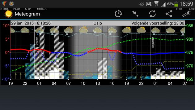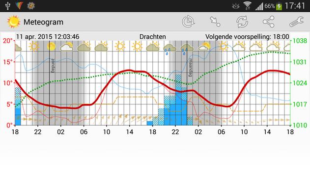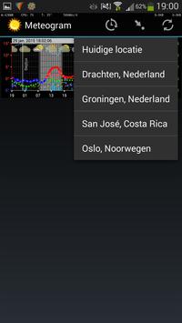 De meteogram app geeft een grafische weersvoorspelling van de huidige of een gedefinieerde locatie. In de weergave staan: