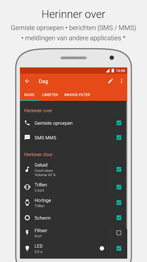 ★ Meldingen via: geluid, trillen, scherm aan, flitser (wordt niet op alle appraten ondersteund), LED.