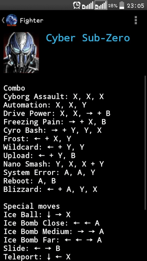 Move list for characters from Mortal Kombat Komplete Edition - Allows you to see combo in comliance with your keyboard or gamepad - Includes combo-attacks, special moves and fatality for all characters
