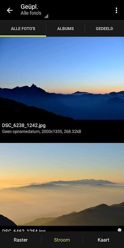 - Wissel tussen de drie weergaven (Raster/Stroom/Kaart) om uw foto's te bekijken op een manier die past bij uw wensen.