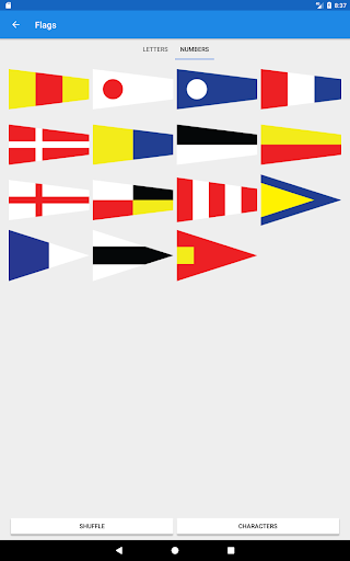 You will learn numerical and alphabetical flags. Each card additionally contains semaphore flags and Morse code. Also you always may take a quiz and see your progress. Enjoy.
