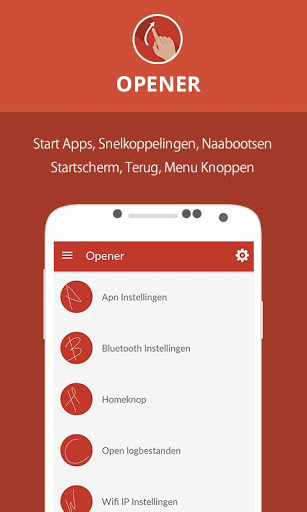 Je kunt de systeeminstellingen op elk moment veranderen, en de symbolen die je gekozen hebt aanpassen. Het is niet nodig om standaard symbolen of alfabetten te gebruiken, daarmee is het een van de meest gebruikervriendelijke apps met een perfecte gebruikersinterface beleving. Je kunt knoppen voor home, terug en menu aanmaken op het startscherm van Opener.