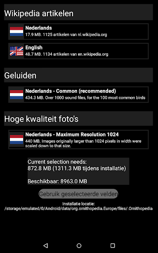 - Offline Wikipedia artikelen in maximaal twee talen ( 3-50 MB elk, afhankelijk van de geselecteerde talen)