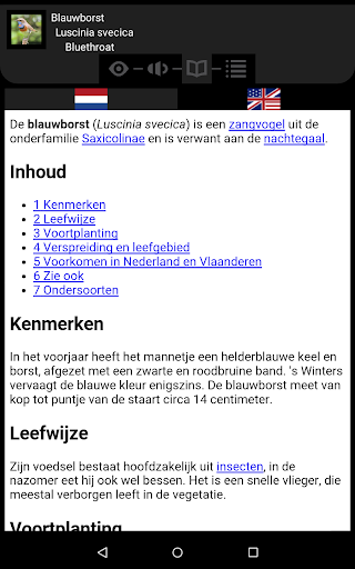 De App bevat meer dan 3200 foto's, 29000 online geluidsfiles en 2500 online Youtube video's en veel meer. U kunt uw eigen foto's of geluiden gemakkelijk toevoegen. Daarnaast is er de mogelijkheid om een vogel te zoeken op uiterlijke kernmerken en is er een Ornitho-Trainer, om kenmerken van veelvoorkomende vogels te leren herkennen. Het grootste deel van de App is in het Nederlands vertaald door Helen.