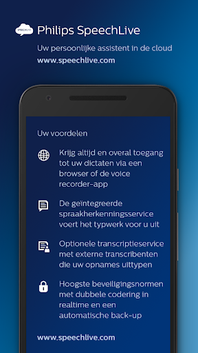- Stuur uw dictaten naar SpeechLive en ze zullen beschikbaar zijn in de nieuwe app: https://play.google.com/store/apps/details?id=com.philips.dictation.speechlive